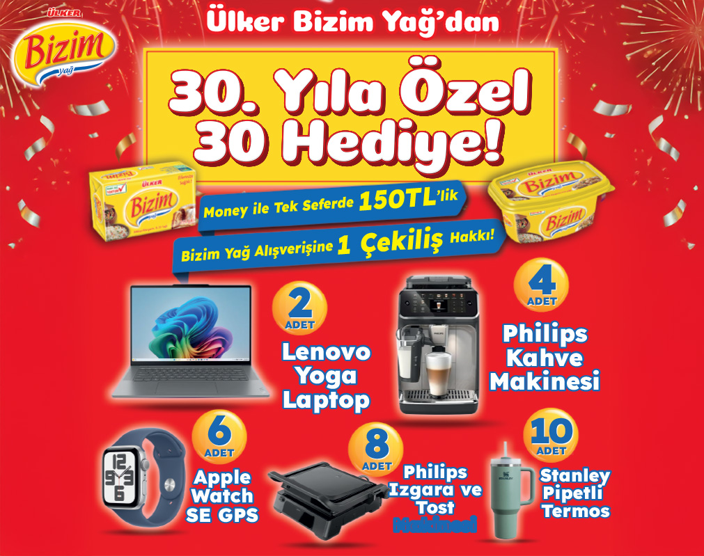 Bu kampanya Migros Ticaret A.Ş. tarafından MPİ’nin 18.09.2025 tarih ve E-24951361-255.01.02-78120 sayılı izni ile Mucize Tanıtım tarafından düzenlenmektedir. 09.10.2025 (Saat 10.00) – 09.11.2025 (Saat 22.00) Kampanya tarihleri arasında Migros Ticaret A.Ş. tarafından gerçekleştirilecek olan; Türkiye genelindeki tüm Migros, 5M Migros, Migrosjet Mağazaları’ndan, Migros Sanal Market veya Migros Hemen’den Besler Gıda ve Kimya Sanayi ve Tic. A.Ş. firmasına ait Bizim Yağ ürünlerinden birlikte veya ayrı ayrı tek seferde 150 TL ve katları tutarında (Her 150 TL için bir çekiliş hakkı) alışveriş yapan Money veya Money Bonus üyesi müşteriler kampanyaya katılacaklardır. İkramiye olarak, 2 kişiye 49.999 TL değerinde Lenova Yoga 7 Laptop Dizüstü Bilgisayar Core Ultra 5 125U-16GB-512GB SSD 14” W11, 4 kişiye 30.999 TL değerinde Philips EP5547/90 Tam Otomatik Espresso Makinesi, 6 kişiye 11.999 TL değerinde Apple Watch SE GPS 40 mm, 8 kişiye 9.499 TL değerinde Philips HD6307/70 7000 Serisi Contact Tost ve Izgara Makinesi, 10 kişiye 2.999 TL değerinde Stanley Quencher H2.O Flowstate Pipetli Termos 1.18 LT verilecektir. Çekiliş 19.11.2025 tarihinde saat 09:30’da Mucize Tanıtım ve Organizasyon Hizmetleri Ltd. Şti. Atakent Mah. 221 sk. Rota Office No:3A D: 16 Küçükçekmece/İstanbul adresinde yapılacaktır. Kazanan talihliler 21.11.2025 tarihli Takvim gazetesinde duyurulacaktır. 06.12.2025 tarihine kadar başvurmayan asillerle, 21.12.2025 tarihine kadar başvurmayan yedeklere ikramiyeleri teslim edilmez. Kampanya Money veya Money Bonus üyesi müşterilere yöneliktir. Ad/Soyad ve gsm no, bilgileri eksik veya kayıtlı olmayan Money veya Money Bonus üyesi müşterilere çekiliş hakkı verilmeyecektir. Kampanya tarihleri arasında alışverişlerini iptal eden müşterilerin çekiliş hakları da iptal edilecektir. Bir kişi birden fazla ikramiye kazanamaz. Katılımcının ikramiye kazanması durumunda adres bilgileri, eksik veya bilinmiyor ise gazetede yapılan ilan tebliğ için yeterli olacaktır. Migros Ticaret A.Ş. ve Mucize Tanıtım ve Organizasyon Hizmetleri Ltd. Şti. çalışanları ile 18 yaşından küçükler kampanyaya katılamaz, katılmış ve kazanmış olsalar dahi ikramiyeleri teslim edilmez. İkramiyeye konu olan eşya ve/veya hizmetin bedeli içinde bulunan KDV+ÖTV gibi vergiler dışındaki vergi ve diğer yasal yükümlülükler talihliler tarafından ödenir. Kampanyaya katılan herkes bu şartları kabul etmiş sayılacaktır. Görseller temsilidir.
