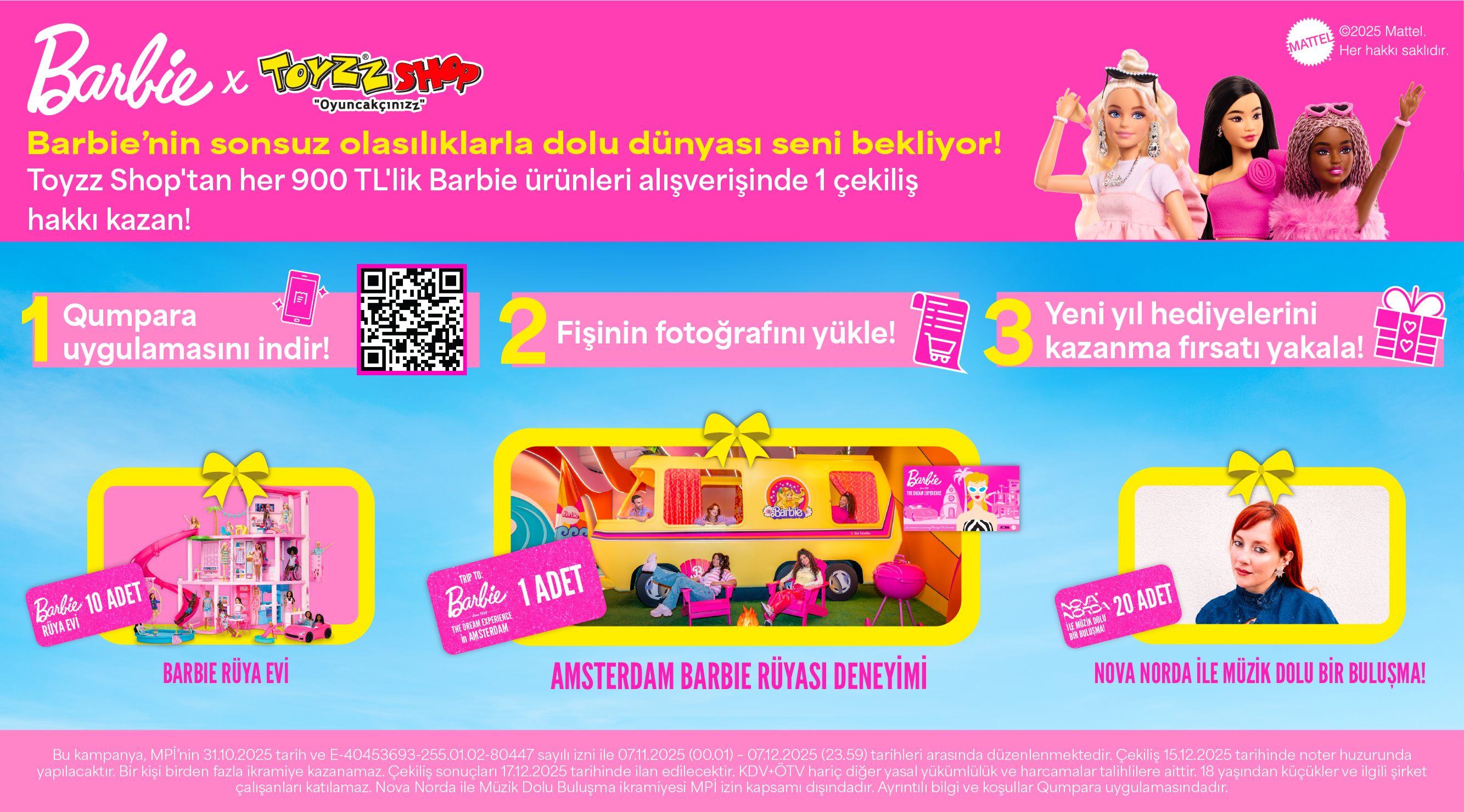 07.11.2025 (00.01)- 07.12.2025 (23.59) tarihleri arasında Türkiye Genelindeki Toyzz Shop Mağazaları ve Linkleri görmeye yetkiniz yok. Kayit olun veya giris yapin internet sitesinden lisanslı Barbie  ürünlerinden birlikte veya ayrı ayrı tek seferde 900.-TL ve katları tutarında (her 900.-TL için 1 çekiliş hakkı) satın alarak, ücretsiz olarak iOS ve Android Mobil Qumpara uygulamasını indirip, ad-soyad-adres-gsm no bilgilerini girerek üye olduktan sonra (ToyzzShop) kampanya adını seçerek alışveriş fişi/faturasının fotoğrafını (fiş/faturanın tamamının görünmesi ve fotoğrafın net olması gerekmektedir) yükleyen bireysel müşterilere, sistem tarafından kontrolü yapılıp onaylandıktan sonra fiş/fatura üzerindeki her 900.-TL ve katları tutarındaki lisanslı Barbie ürünü  için 1 çekiliş hakkı verilerek kampanyaya dahil edileceklerdir. iOs ve Android uygulamalarından fiş/fatura girilmesi kampanya süresince her gün 24 saat kesintisiz olup sisteme son fiş/fatura gönderme tarihi 12.12.2025(23.59)’dir. Qumpara uygulaması için girilen üyelik bilgilerinin doğruluğu ve yeterliliğinin ispatı ile fiş/faturanın okunabilir, sağlam, yıpranmamış ve Qumpara uygulamasına yüklenmesine uygun şekilde saklanması katılımcının sorumluluğundadır.  Üyeliğini iptal eden tüketiciler kampanyaya dahil edilmez. Katılımda sunulan tüm bilgilerin doğruluğu ve yeterliliğinin ispatı katılımcının sorumluluğundadır. Çekiliş; 15.12.2025 tarihinde, saat 10:30’da Umut Çekiliş ve Tanıtım Hiz. Tic. Ltd. Şti., Merkez Mah. İzzetpaşa Sk. Ay-Han İş Merkezi No:14/29 Şişli-İstanbul adresinde, noter huzurunda yapılacak olup dileyen herkesin katılımına açıktır. Çekilişte, 1 kişiye Amsterdam Seyahati; (2 yetişkin+1 çocuk) 08-10 Nisan 2026 tarihlerinde 4* otelde 2 gece 3 gün triple oda+kahvaltı konaklama, Barbie Dream Experience Müzesi giriş biletleri, İstanbul-Amsterdam-İstanbul ekonomi sınıfı gidiş dönüş uçak biletleri dahildir (Vize ve pasaport işlemleri, çıkış harcı, belirtilmeyen hizmetler ve şahsi harcamalar talihliye aittir.) (Seyahat bedeli: 100.150,00 TL) ve 10 kişiye Barbie Dream House HMX10 (adedi: 22.799,99 TL) ikramiyesi verilecektir. Seyahat ikramiyesini talihliden başkası tarafından kullanılamaz, devredilemez ve nakde çevrilemez. Bir kişi birden fazla ikramiye kazanamaz. Çekiliş sonuçları 17.12.2025 tarihli Birgün Gazetesi’nde duyurulacaktır. Adres bilgisi kayıtlı olan asıl ve yedek talihlilere taahhütlü posta yolu ile tebligat yapılacaktır. Postada meydana gelebilecek gecikme ve aksaklıklardan kampanya düzenleyici ve çekiliş ajansı sorumlu değildir. Katılımcının ikramiye kazanması durumunda, adres bilgileri eksik veya bilinmiyor ise gazetede yapılan ilan tebliğ için yeterlidir. İkramiye kazanan asıl talihlilerin 01.01.2026 ve yedek talihlilerin 16.01.2026 tarihine kadar kimlik, ikramiye kazanılan fiş/fatura ve iletişim bilgileri ile Linkleri görmeye yetkiniz yok. Kayit olun veya giris yapin mail adresine başvurmaları gereklidir. Başvuru sonrası talep edilecek belgeleri belirtilen tarihlere kadar eksiksiz olarak çekiliş ajansına teslim etmeyen talihliler ikramiyelerini alamazlar. İkramiye tesliminde, ikramiye kazanılan fiş/fatura ibrazı zorunludur. Fiş/faturanın okunabilir şekilde muhafaza edilmesi ve belirtilen tarihlere kadar başvuruda bulunma sorumluluğu talihlilere aittir. Başvuru yapmayan ve istenilen belgeleri süresi içinde teslim etmeyen talihliler ikramiyelerini alamazlar. Ayrıca, Milli Piyango İdaresi izin kapsamı dışında 20 kişiye Nova Norda isimli sanatçının katılımıyla düzenlenecek olan Barbie-Nova Norda etkinliği davetiyesi (Etkinlik ücretsiz olup 1 davetiye ile 1 yetişkin+1 çocuk giriş yapabilir), (Davetiye sadece etkinlik alanına giriş içindir, etkinlik alanına ulaşım katılımcıya aittir) ikramiyesi verilecektir. Kampanya bireysel tüketicilere yöneliktir. Kazanılan hak devredilemez, nakde çevrilemez, değiştirilemez. İnternet sitesinden yapılan alışverişlerin alışveriş fiş/ faturası satın alınan ürünle birlikte en geç 3 gün içerisinde müşterilere ulaştırılacaktır. Qumpara uygulamasına her seferinde sadece 1 adet fiş/faturanın fotoğrafı yüklenebilir. Birden fazla fiş/fatura yer alan yüklemeler kabul edilmeyecektir. Sisteme yüklenen fiş/fatura değerlendirilerek aynı fiş/fatura ile yapılan mükerrer katılımlar elenerek ilk gönderilen fiş/fatura dikkate alınacak olup yükleme reddedilirse, bu durum sebebi ile birlikte uygulama içerisinde tüketiciye bildirilir. Tüm katılımlar için otomatik ayrıştırma ve fiş/fatura kontrolleri yapıldıktan sonra başarısız katılım yapanlara “Başarısız Katılım” bilgisi ve başarılı katılım yapanlara ise “Başarılı Katılım” bilgisi ile birlikte katılım sıra numarası bilgisi (ilk başarılı katılıma 1’den başlayarak takip edere sıra numarası verilecektir) tüketiciye Qumpara uygulaması içinden bildirilecektir. Tüketici; Qumpara uygulamasındaki üyelik hesabını dilediği zaman kontrol edebilir ve katılım haklarını görebilir. Katılımlarda fiş/fatura no ve tarih, ad-soyad, gsm no bilgileri dışında diğer bilgileri eksik olsa dahi katılımcılar çekilişe dahil edileceklerdir. Farklı marka ve ürünlerin yer aldığı set ürünler kampanyaya dahil değildir. Mali değeri olmayan belgeler, yemek çekleri ve kartları ile yapılan alışverişlerde verilen bilgi fişleri, sipariş fişi, sevk irsaliyesi, tahsilat makbuzu, fiş kopyası, temel gıda, gıda, temizlik malzemesi yazılı satış fişleri geçerli değildir. Üzerinde ürün ismi yer alan fiş/faturalar geçerlidir. Qumpara uygulaması, kullanıcının katılımlarını ayrıntılı şekilde inceleyerek, kötü niyetli ve usulsüz katılım tespiti halinde kullanıcılardan al