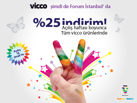 İlk mağazasını geçtiğimiz günlerde Terasium AVM’ de açan Vicco, 2. Mağazasını 15 Ocak’ta Forum İstanbul’da açıyor. Açılış sebebiyle de tüm hafta boyunca bütün Vicco ürünleri sezon indirimi haricinde %25 indirimle satışa sunuluyor.